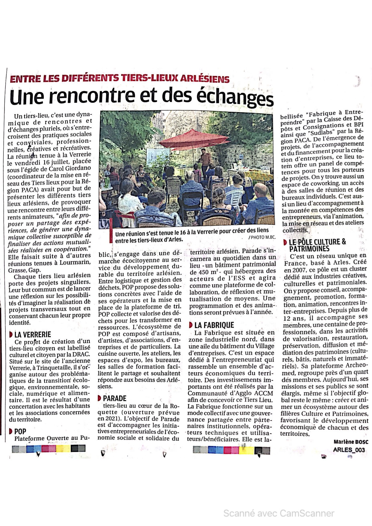 Vendredi 16 juillet 2021 s'est tenu à Arles une rencontre entre plusieurs représentant de Tiers-Lieux implantés dans la Région sud Provence-alpes-Côte d'Azur. 5 tiers-lieux arlésiens se sont mobilisés pour accompagner le Hub du sud (réseau en préfiguration des tiers-lieux régionaux) dans l'organisation de cette journée riche en échanges et rencontres. De belles émulations et de réflexions autours de la construction de lieux hybrides, innovants et d’accueil pour tous les publics ! Merci à La Provence - édition Arles - pour ce bel article.